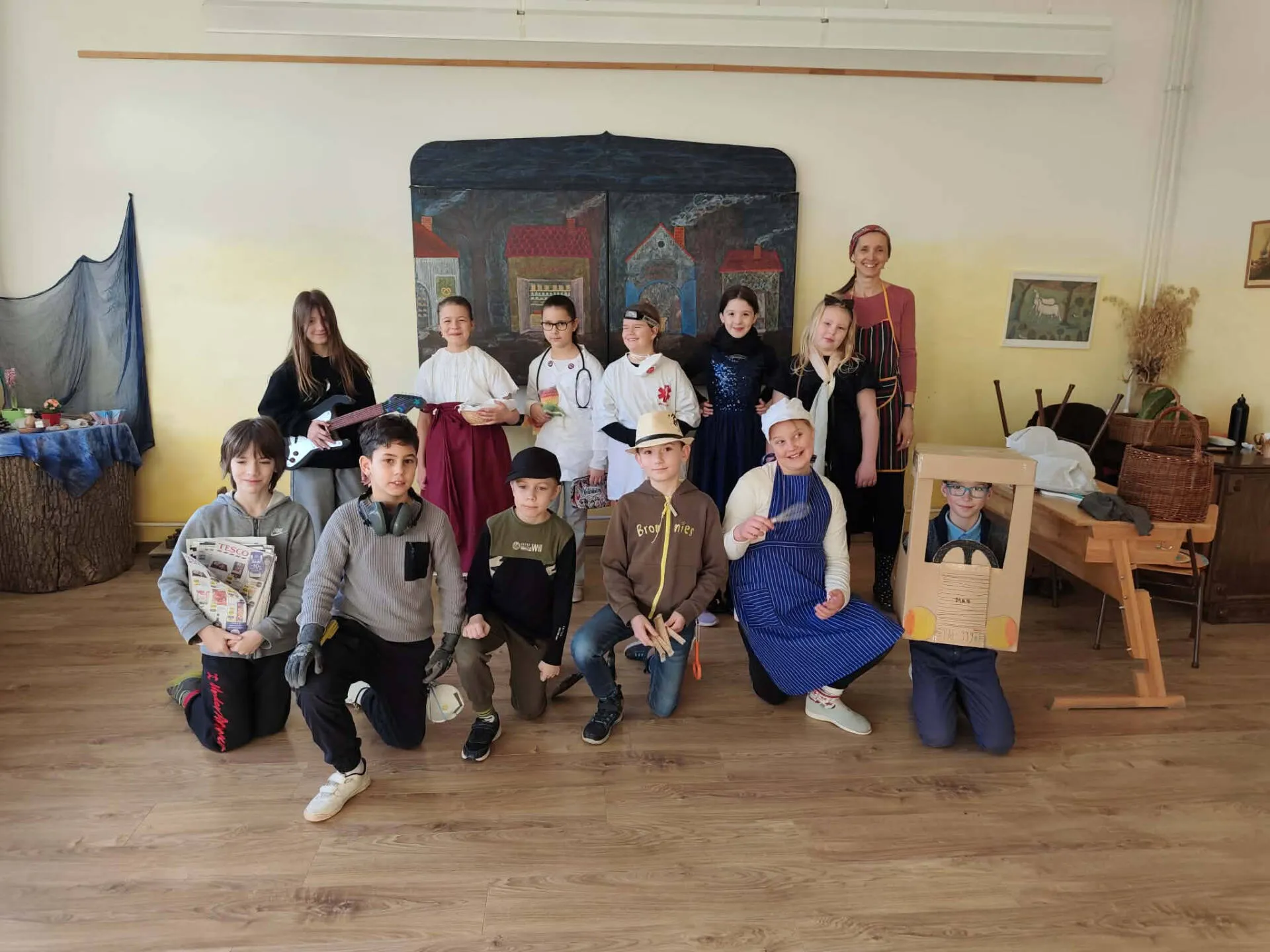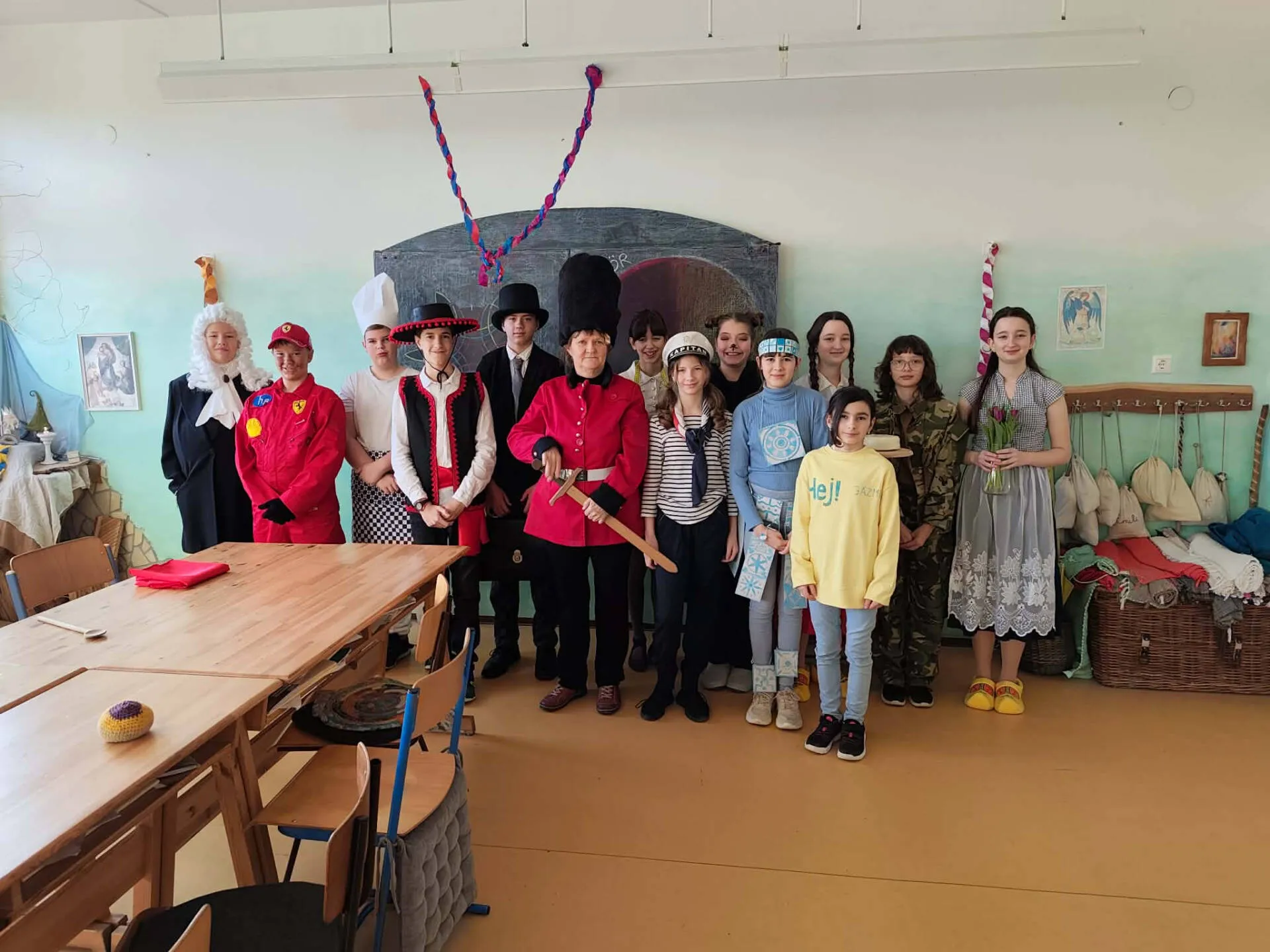 A gyermekek számára ez az ünnep lehetőséget ad arra, hogy játékosan megéljék az átváltozás örömét, és elmélyüljenek a képzelet gazdag világában. Iskolánkban a farsang az adott osztály tanulmányaihoz kapcsolódik: a gyerekek osztályfokonként, az éppen tanult korszakhoz, történetekhez vagy témákhoz illeszkedve öltöznek jelmezbe. Így a beöltözés nem csupán játék, hanem a tanultak élményszerű továbbélése is, amely közös alkotásban és örömteli együttlétben teljesedik ki.
